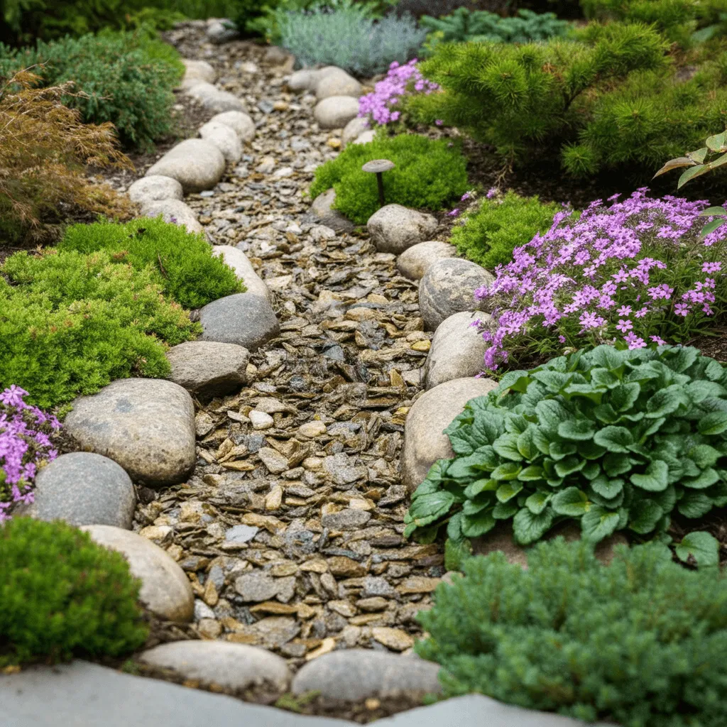 A dry stream bed, lined with smooth stones, gives the illusion of running water without the hassle of a pond. Add clusters of plants like ajuga or creeping phlox at the edges for a polished look.