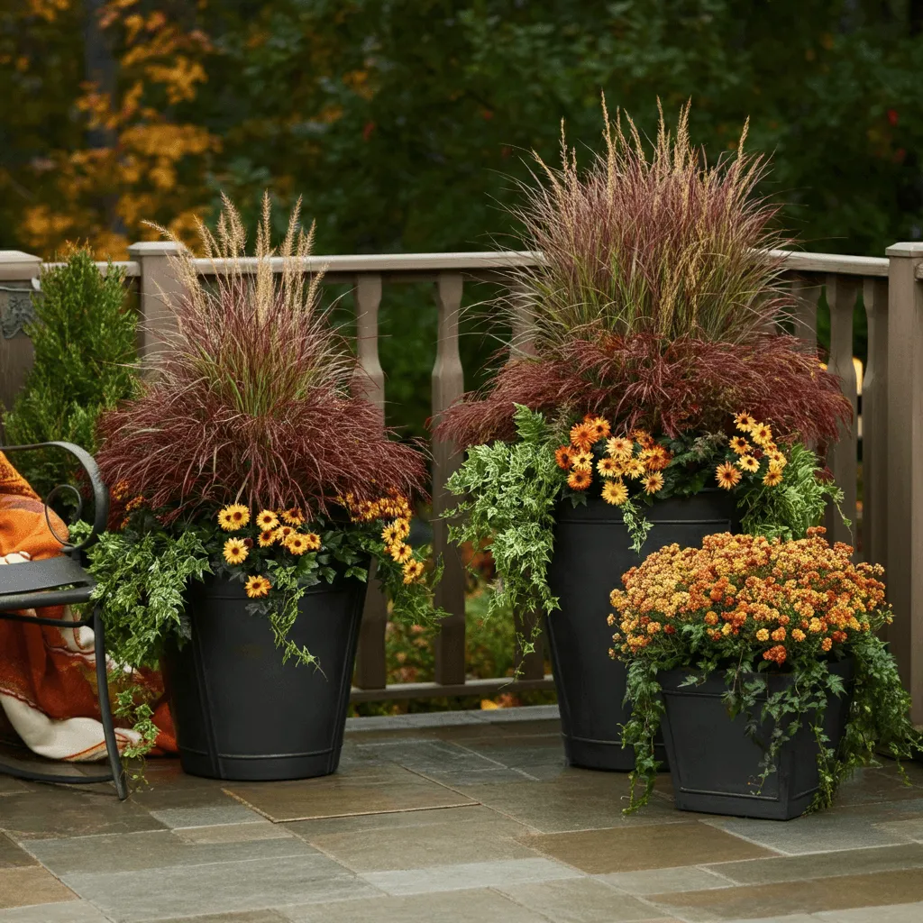 Use plants like chrysanthemums, asters, and violas, paired with decorative accents like pumpkins and hay bales.